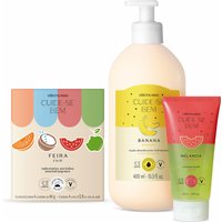 Combo Cuide-se Bem Feira Cuidados Corporais: Sabonetes Sortidos 4x80g + Sabonete Líquido Melancia 150ml + Loção Corporal Banana 400ml: Com Cuide-se Bem Feira , a feira é diferente, está em toda parte, vai com você aonde você for, no dia e na hora que você quiser! O Combo Cuide-se Bem Feira Cuidados Corporais proporciona uma mistura de frutas da estação para cuidados corporais com diferente fragrâncias, texturas e novas maneiras de se amar: SABONETES SORTIDOS: Os Sabonetes em Barra Sortidos Cuide-se Bem Feira trazem uma salada de frutas* com tangerina , coco , melancia e maçã verde para o seu banho, estes sabonetes não só higienizam, mas também proporcionam espuma cremosa, pele perfumada e aveludada e são livres de parabenos, silicones e petrolatos. SABONETE LÍQUIDO MELANCIA: O Sabonete Líquido Corporal Cuide-se Bem Feira Melancia mantém sua pele hidratada e com um cheirinho energizante de melancia. Contendo extrato de melancia* , este sabonete não só higieniza, mas também proporciona mas também proporciona espuma cremosa, pele perfumada e aveludada. LOÇÃO CORPORAL BANANA: A Loção Desodorante Hidratante Cuide-se Bem Feira Banana proporciona hidratação com um cheirinho surpreendente de banana. Formulada com Manteiga de Karité e Glicerol , esta loção corporal possui textura cremosa , extrato de fruta* e ativos hidratantes para 48h de hidratação. Nenhum produto O Boticário é testado em animais, ou seja, este combo possui selo Cruelty Free. *Os itens possuem cheirinho inspirado nas frutas, mas não contêm frutas na composição. Produtos não comestíveis.