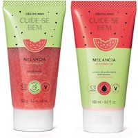Combo Cuide-se Bem Melancia: Gel Esfoliante Corporal 150g + Creme Hidratante Corporal 150ml: Conheça o Combo Cuide-se Bem Melancia que vai te levar ao mundo surreal das frutas durante o banho. Seus produtos hidratam a pele , além de renovar sua textura, tendo a Melancia como protagonista, o que garante uma fragrância Frutal suculenta e inspiradora. Veganos e com embalagem feita com papel reciclado , levam a sustentabilidade para o seu dia a dia. ESFOLIANTE CORPORAL O Gel Esfoliante Corporal Cuide-se Bem Melancia vai deixar sua pele lisinha e perfumada mesmo após o banho! Dá só uma olhada nos benefícios: – Remove as impurezas e células mortas – Sensação de pele hidratada – Textura esfoliante. Livre de sulfatos, parabenos e petrolatos , contém 94% dos ingredientes naturais. Com embalagem em papel reciclado, o esfoliante corporal de melancia oferece autocuidado de um jeito prático e sustentável. CREME HIDRATANTE CORPORAL O Creme Desodorante Hidratante Cuide-se Bem Melancia conta com Extrato da Fruta e ativos hidratantes para você se deliciar debaixo do chuveiro ou fora dele. Confira seus benefícios: – Fragrância frutal inspirado na melancia – Textura cremosa – Creme com ou sem enxágue – Hidrata a pele. Com Manteiga de Karité, Glicerol e 95% dos ingredientes naturais , garante uma pele macia e perfumada. Nenhum produto O Boticário é testado em animais, ou seja, estes itens possuem selo Cruelty Free.